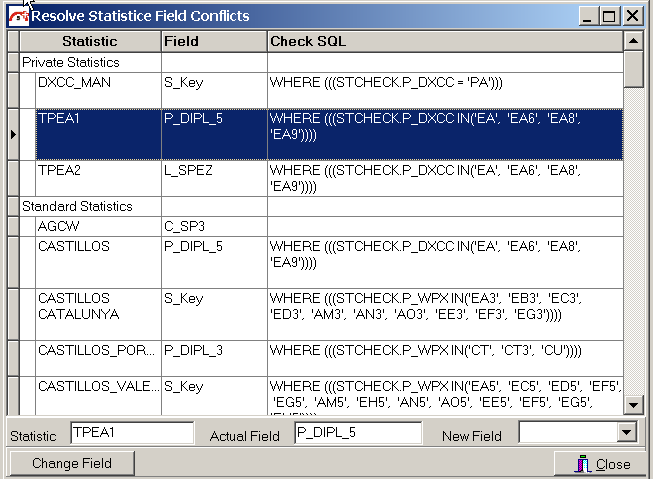 Field conflicts do exist a field is used to store information for more than one statistic. A field can be used for many statistics the only rule is, that it can only contain the value for one statistic. Because not every QSO qualifies for all statistic, fields can be shared as long as a QSO does not qualify for more than one statistic which shares the field. The check-sql is used the check if a QSO qualifies for a statistic.