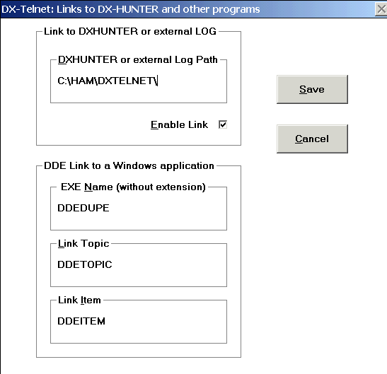 the "Enable Link" check box and type C:\DXTELNET\DDEDUPE\ in