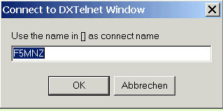 SWISSLOG will automatically connect to the last connected cluster. The first time, or each time you start DX-Telnet with a new cluster connected, you need to connect to SWISSLOG. To connect you have to use the name displayed between [] in the DX-Telnet window title. Because DX-Telnet connects automatically to the last used cluster when started SWISSLOG can connect automatically most of the time.