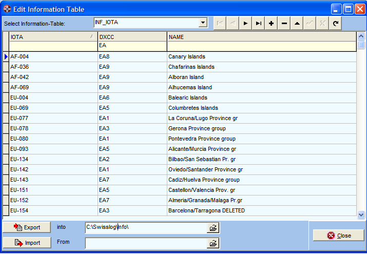 With the Information-Tables (short: Info-Tables) you can add additional information to the SWISSLOG database and associate them with SWISSLOG fields. Info-Tables can be used for many purposes. The most common is to add the descriptions for abbreviations used in awards like IOTA, US-States, US-Counties, DOK or the Callsign and name of DIG or TEN-TEN members.