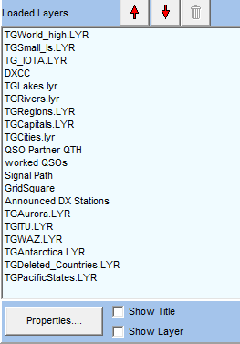 To modify the properties of a layer select it in the layer list. The most important properties, Show Layer and Show Title, can be selected directly with the checkboxes at the bottom of the layer list.