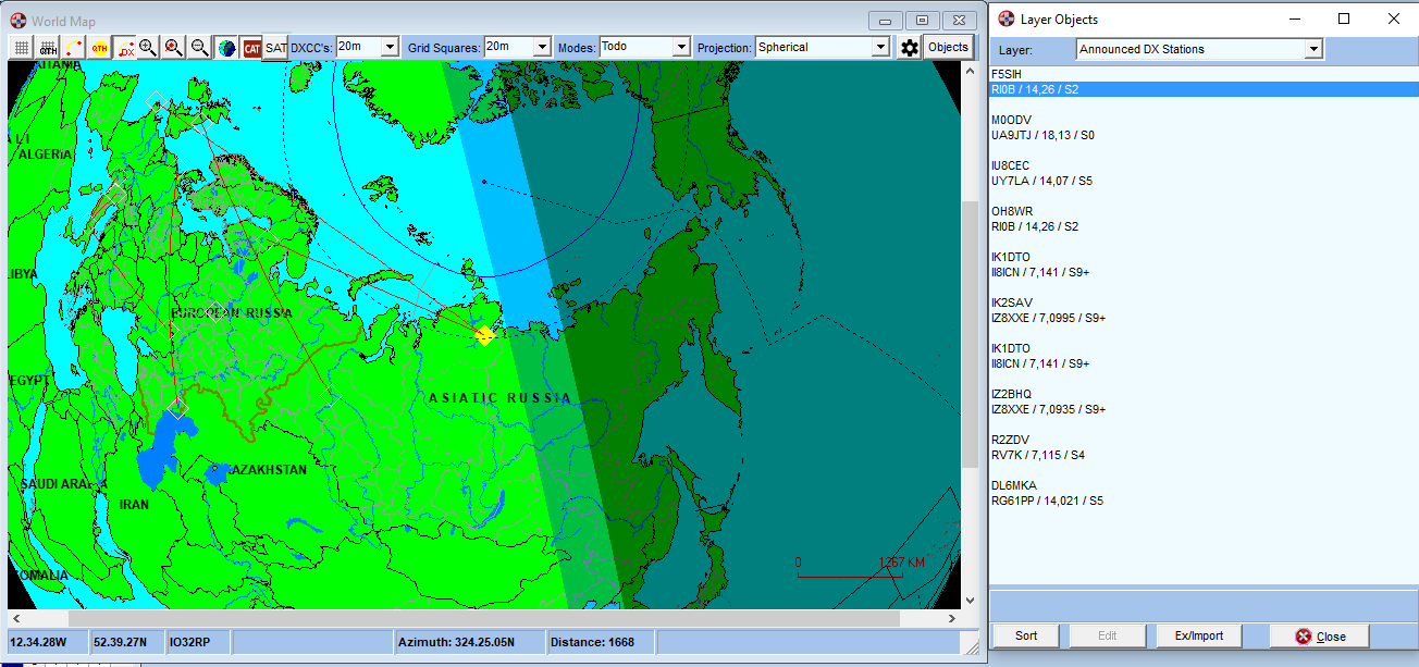 - show DX stations, spotters, and path on the map including the predicted signal strength