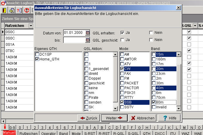 Benutzen der Logbuchansicht, es gibt mehrere Methoden um die QSO's für ein Diplom auszuwählen. Dieser Abschnitt beschreibt eine Technik die fast automatisch abläuft.