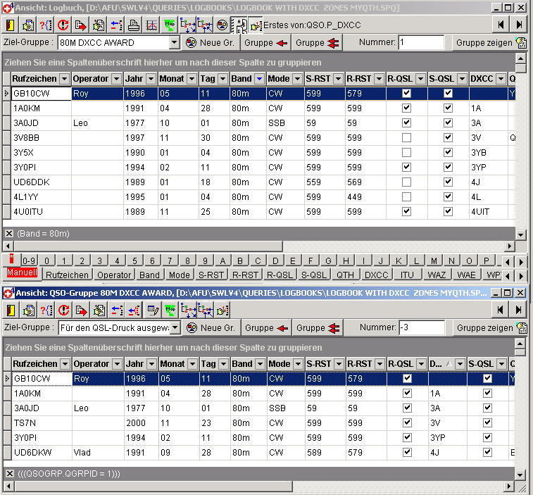 Das Ergebnis der QSO Auswahl wird in der Logbuchansicht angezeigt. Wenn Sie die oben aufgeführten Schritte durchgeführt haben, werden nur bestätigte CW und SSB QSO auf 80m angezeigt.