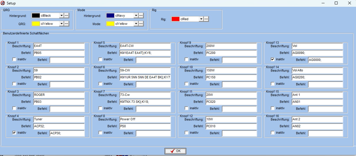 Klicken Sie mit der rechten Maustaste, um den Konfigurationsdialog aufzurufen, in dem Sie die Farben ändern und eine Beschriftung sowie den zu sendenden Befehl für jede der 16 verfügbaren Tasten zuweisen können. Aktivieren Sie die Option „Inaktiv“, um die Dual-Action-Taste zu aktivieren: Je nachdem, ob die Taste gedrückt (aktiv) oder nicht gedrückt (inaktiv) ist, wird ein anderer Befehl gesendet. Die Einstellungen der benutzerdefinierten Tasten werden unabhängig für jeden Transceiver gespeichert! Dies ist ein Beispiel für den Yaesu FTDX-101MP (DANKE EA4T!):
