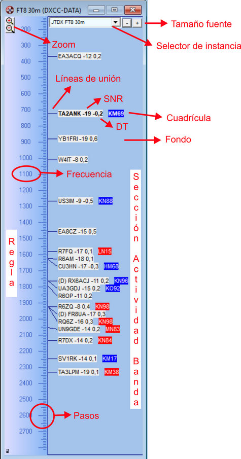 Para abrir una ventana de Mapa de Bandas de WSJT-X / JTDX / MSHV seleccione Ver | Mapa de Bandas WSJT-X / JTDX / MSHV. Así es como se ve la ventana (incluye una descripción de las funciones y partes):