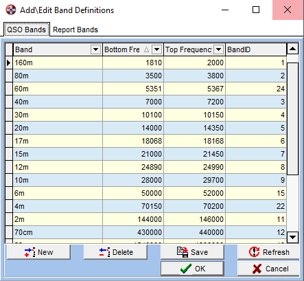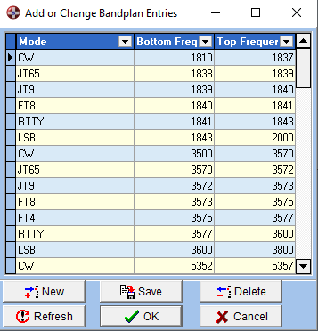 To open the Band - Dialog select Edit ¦ Edit Bandplan from the main menu. This will open the following dialog window: