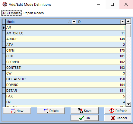 To open the Mode - Dialog select Edit ¦ Add/Edit Modes from the main menu. This will open the following dialog window:
