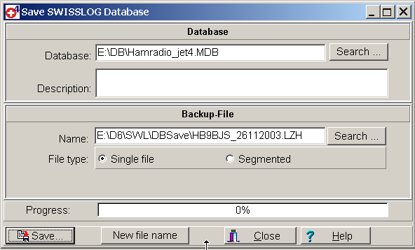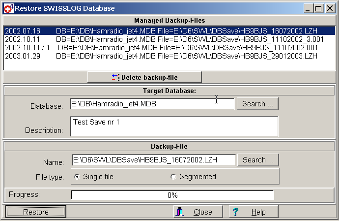 Experienced PC users will recognize the fact that it is very important to save your files regularly. We never know what kind of bizarre situation might occur, it might be an equipment problem such as the hard disk failing, or in today's environment it could be computer virus, or you might accidentally erase or overwrite a critical file. In any case, most of us have experienced this type of failure at one time or another and the thought of loosing your entire Log database is not pleasant. Therefore, SWISSLOG has a special function to save and restore your Log databases.