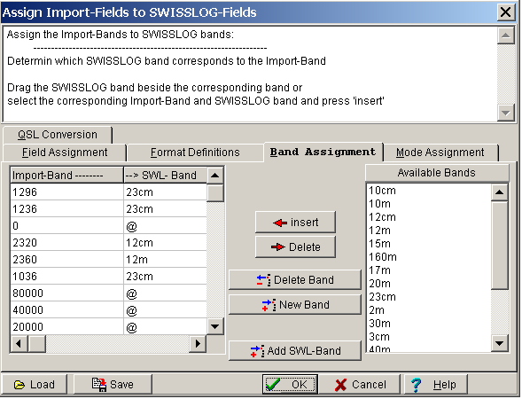 Drag and drop the SWISSLOG band from the list of Available Bands to the SWL-Band list next to the corresponding import band.