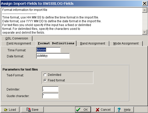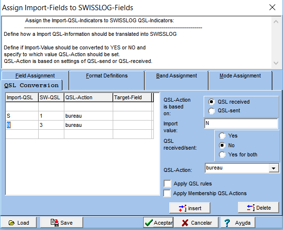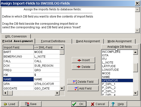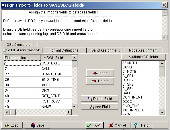 SWISSLOG needs to copy the field values from the import file to the corresponding SWISSLOG fields. It has to convert Band, Mode, QSL indicators, and more. The instructions defining how this must be done are contained in Field Assignment Table.