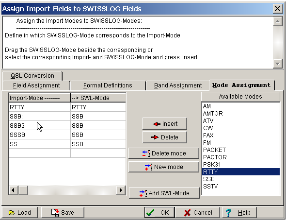 The table on the left displays a list of the modes in the import file (Import Mode) and the corresponding SWISSLOG mode that it will be converted to (--> SWL-Mode).