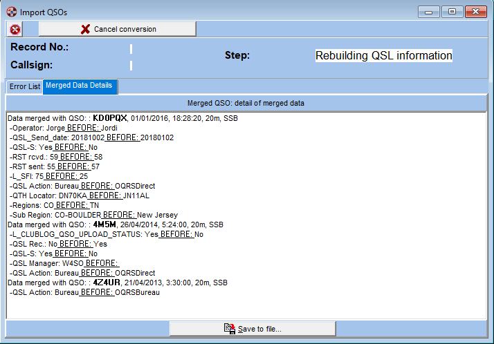 Swisslog will replace the contents of the following fields (only if content is not blank and is different in the source file): LOGBOOK TABLE: L_OPERATOR, L_RSTS, LRSTSNR, L_RSTR, L_RSTRNR, L_QSL_ACTION, L_QSLMGR, L_QSL_RECEIVED, L_QSL RECEIVED DATE, L_QSL_SEND, L_QSL SEND DATE, L_LOTW_RECEIVED, L_LOTW RECEIVED DATE, L_LOTW_SENT, L_LOTW SEND DATE, L_EQSL_RECEIVED, L_EQSL RECEIVED DATE, L_EQSL_SENT, L_EQSL SEND DATE, L_CLUBLOG_UPLOAD_STATUS, L_CLUBLOG_UPLOAD_DATE, L_HRDLOG_UPLOAD_STATUS, L_HRDLOG_UPLOAD_DATE, L_QRZCOM_UPLOAD_STATUS, L_QRZCOM_UPLOAD_DATE, L_SFI, L_INCOMPLETE, L_CREDIT_GRANTED, L_CREDIT_SUBMITTED, L_SAT_MODE, L_SAT_NAME PQTH TABLE: P_CONTINENT, P_DXCC, P_WPX, P_WAE, P_WAZ, P_ITU, P_LATITUDE, P_LONGITUDE, P_TIMEDIFF, P_QTH, P_QTHLOCATOR, P_REGION, P_SUB_REGION, P_IOTA, P_DIPL1...P_DIPL20. Later, during the QSO import process, the "Merged Data Details" tab will be highlighted indicating user that some data have been merged in at least one QSO. Swisslog will provide a very detailed report for every QSO, including data that has been replaced and data existing before. A button is available to Save the report to a file in Rich Text format for future reference: