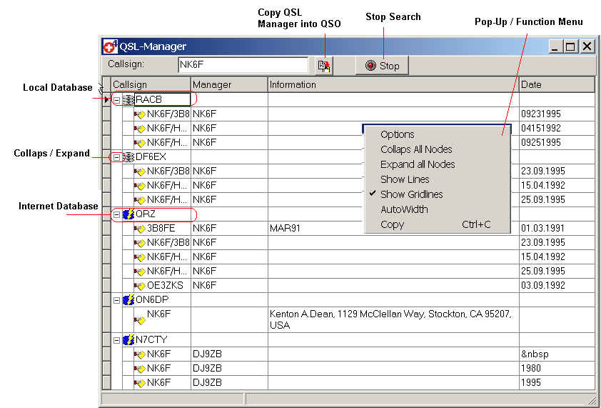 SWISSLOG allows you to search for QSL managers in many local and internet QSL databases. All databases you have specified are searched and the result of all searches is displayed in a special window.