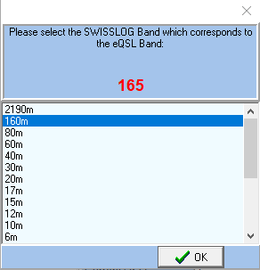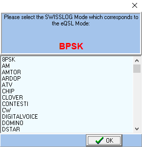 Although eQSL is now ADIF v3 compliant, according to my experience, and depending how the QSO partner has uploaded the QSO into eQSL, it may happen that the ADIF from eQSL contains a mode/submode or band which it's not ADIF v3 compliant. If Swisslog finds a mode/band not ADIF v3 compliant, a dialog window will appear and prompt you to select the right information, which will be stored in the mapping tables.