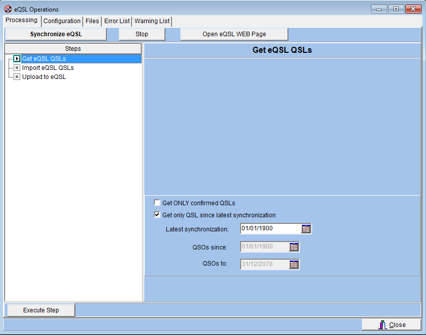 If you uncheck the Get only QSL since latest synchronization option, ALL QSLs from Inbox/Archive will be downloaded (both confirmed and not confirmed). Except if you check the Get ONLY confirmed QSLs, that only confirmed QSL will be downloaded. QSOs since and QSOs to fields will be enabled. IMPORTANT: The selected date range is based on the QSO dates. eQSL only accepts a QSO date range from 01/01/1900 and 31/12/2078. Swisslog will correct the dates if you are trying to set a date out of this range.
