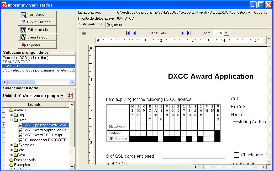DXCC Application with Cover.rpt es un listado con cubierta como el requerido por la ARRL para solicitar el diploma