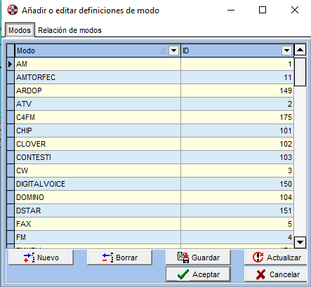 Seleccione Editar ¦ Añadir / Editar los modos en el menú principal. Se abrirá la ventana siguiente:
