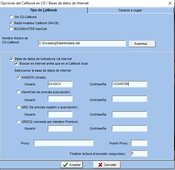 Si tiene una conexión a internet lenta y está trabajando pileups, es probable que tenga muchos retrasos esperando respuesta de la web para obtener los datos del indicativo, causando lentitud en el proceso de log. Asigne en el campo "Finalizar lectura al exceder (segundos)" el tiempo máximo que desea esperar para evitar este comportamiento. Swisslog saltará la consulta a la base de datos de internet después del periodo definido. El valor por defecto es de 5 segundos.