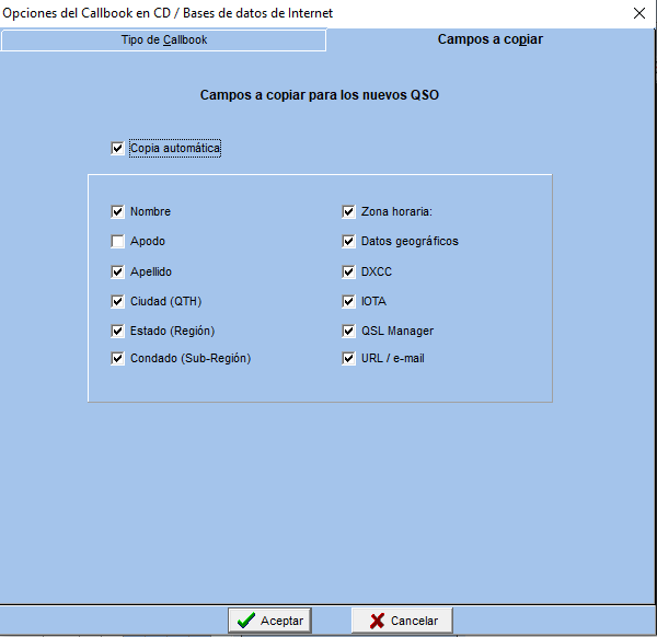 Puede indicar qué campos del Callbook se copiarán al QSO actual. Seleccione la pestaña Campos a copiar. Marque la casilla Copia automática y las casillas de los campos que desee copiar.