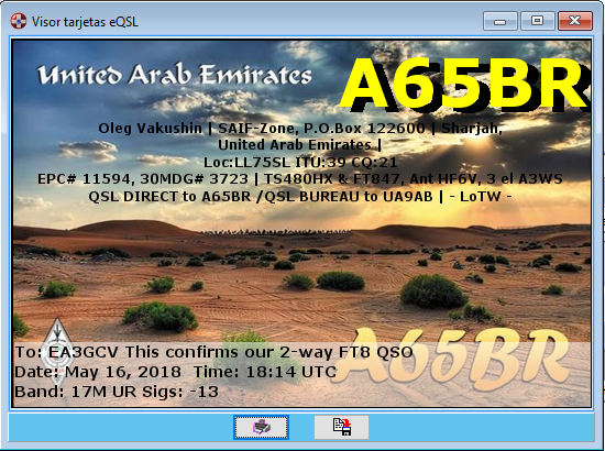 Después de presionar uno de los botones explicados anteriormente, aparecerá el visor de tarjetas mostrando la tarjeta eQSL conteniendo la confirmación del QSO seleccionado con el diseño escogido por el corresponsal: