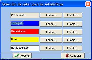Selección de color para las estadísticas: permite seleccionar el color que desea ver en cada indicativo/cuadrícula conforme a su estado de estadística (Confirmado, Trabajado, Necesitado, Nuevo o No necesitado):