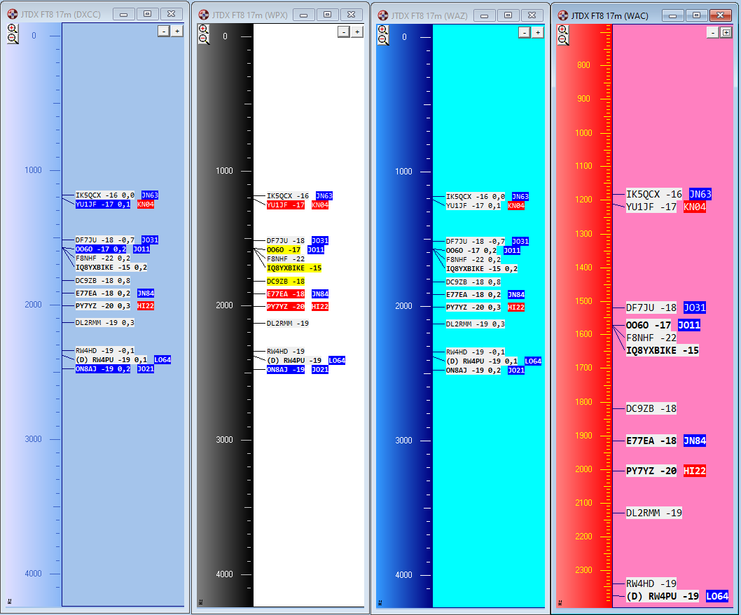 Puede tenerse tantos mapas de bandas como se desee con diferentes filtros (necesitado, trabajado, etc), modos específicos (FT8, JT65, etc), colores, estadísticas, tamaño de fuente y ventana, etc.