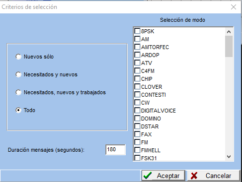 Criterios de selección: Marcar los modos que desea recibir los mensajes y seleccionar los indicativos/cuadrículas que desea ver según el estado de la estadística (Nuevos, Necesitados, Trabajados, Todos). También puede asignar la duración de los mensajes en segundos (valor por defecto: 180 segundos = 3 minutos). Sólo se mostrarán los mensajes que estén dentro del periodo definido. IMPORTANTE: Usar una duración superior de 180 segundos no es útil ya que pronto se le llenará el mapa de bandas y esto afectará al rendimiento general del programa si está la banda muy concurrida. El valor de duración está limitado a 600 segundos (10 minutos).