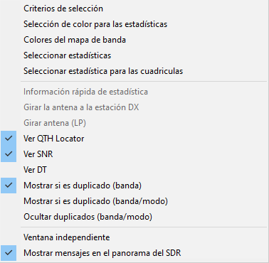 Ver QTH Locator, Ver SNR and Ver DT: Marque las que necesite de acuerdo a sus necesidades. Por defecto, están todas habilitadas excepto Ver DT.