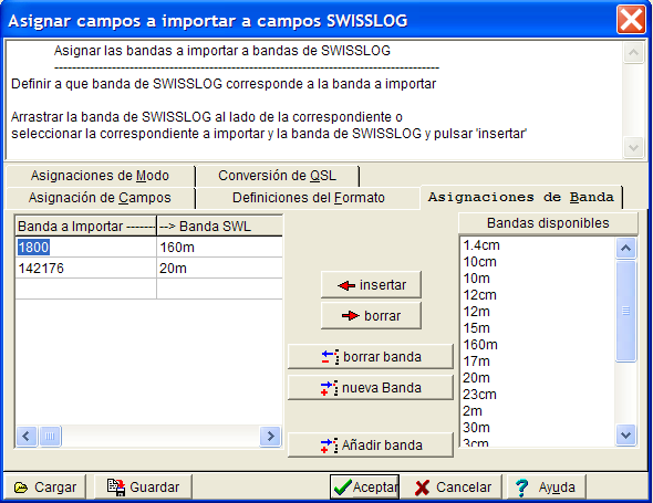 En este cuadro de diálogo se pueden definir cómo se convertirán en SWISSLOG las bandas del fichero a importar. Los programas de registro de QSO antiguos no disponían de un sistema que asegurase la introducción consistente de la banda, por eso, seguramente tendrá entradas en esta lista. Durante el proceso de importación, SWISSLOG se para cuando encuentra una banda no válida en el fichero a importar y le pide que indique a qué banda hay que convertirla.