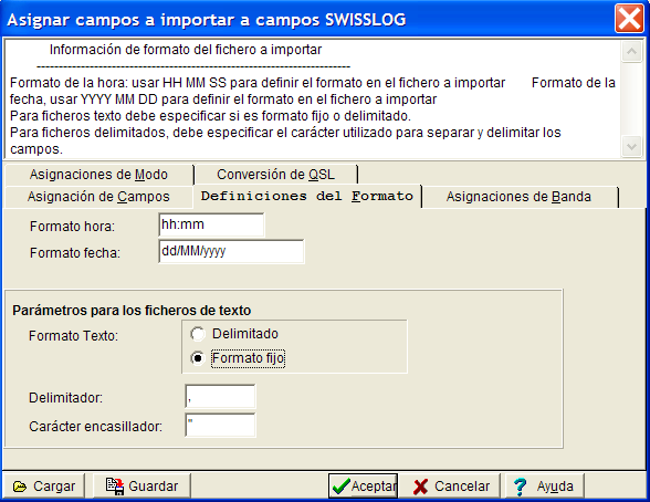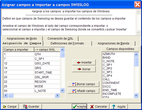 SWISSLOG necesita copiar los valores de los campos del fichero origen a los correspondientes en SWISSLOG, como la banda, modo, indicadores de QSL, etc. Las instrucciones que definen cómo debe hacerse esto están en la Tabla de asignación de campos.