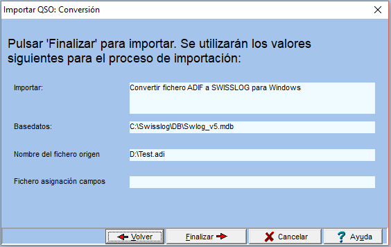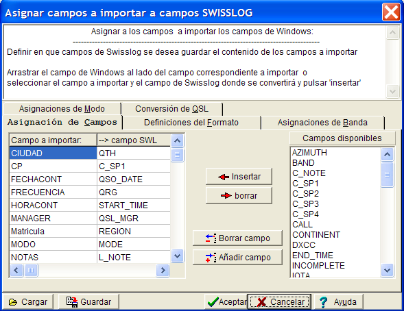 En la importación de ficheros de la versión del DOS de SWISSLOG y en ficheros ADIF, SWISSLOG ya sabe la asignación de los campos estándar, sin embargo, habrá que asignar los campos que no son habituales.