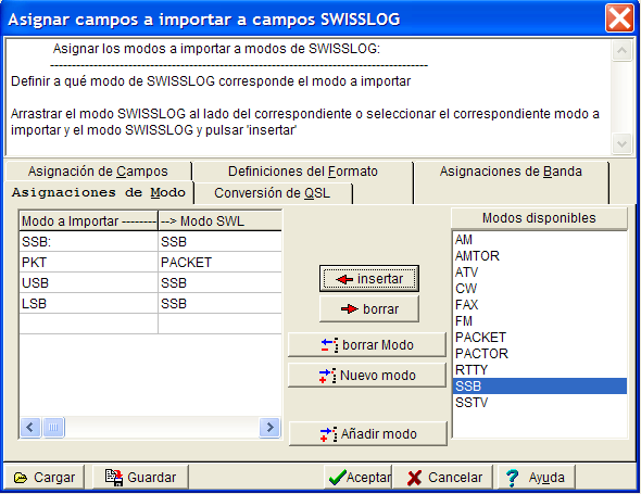En este cuadro de diálogo se puede definir como se convertirán en SWISSLOG los modos del fichero a importar. Los programas de registro de QSO antiguos no disponían de un sistema que asegurase la introducción consistente del modo, por eso, seguramente tendrá entradas en esta lista. Durante el proceso de importación, SWISSLOG se para cuando encuentra un modo no válido en el fichero a importar y le pide que indique a qué modo hay que convertirlo.