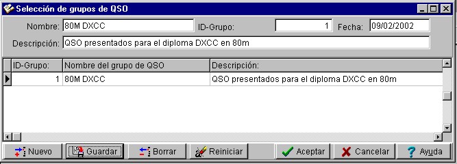Crear un grupo de QSOEn este paso se explica el proceso de crear un grupo de QSO. Una vez definido el grupo se añadirán los QSO que hayan sido seleccionados para un diploma. Haga clic para más detalles en Añadir QSO al grupo de QSO.