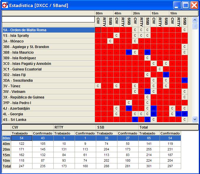 - Mostrar todos los QSO para la celda seleccionada. Se muestran todos los QSO que pertenecen a la estadística según el tipo de celda. Haciendo doble clic en ellas se muestran sólo los QSO que corresponden al estado mostrado en la celda. Con esta función, sin embargo, se muestran todos los QSO independientemente del estado.