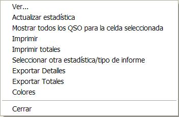 - Actualizar estadística. Recalcula la estadística. Utilice esta opción si se ha añadido o modificado QSO mientras estaba activa la vista de estadística.