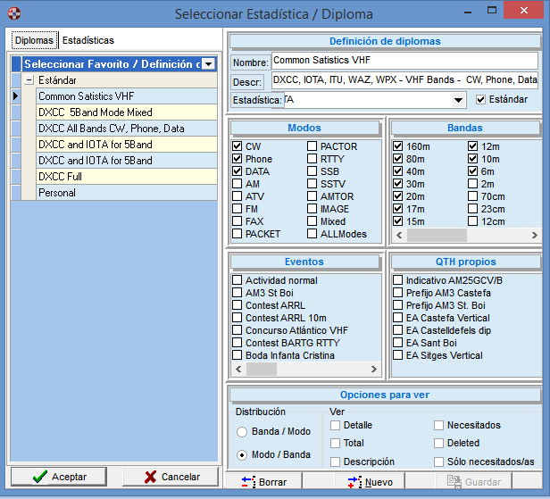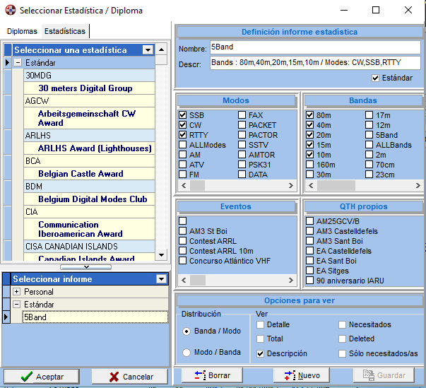 Seleccione las Bandas y Modos que se desean ver para esta estadística marcando en la casilla correspondiente. Tenga en cuenta que hay relaciones de bandas y modos. La secuencia en que se seleccionen las bandas y modos definirá el orden que se verán en la vista de estadística. Puede cambiar la secuencia seleccionando una banda o modo y moverlo arriba o abajo con los botones de las flechas correspondientes.